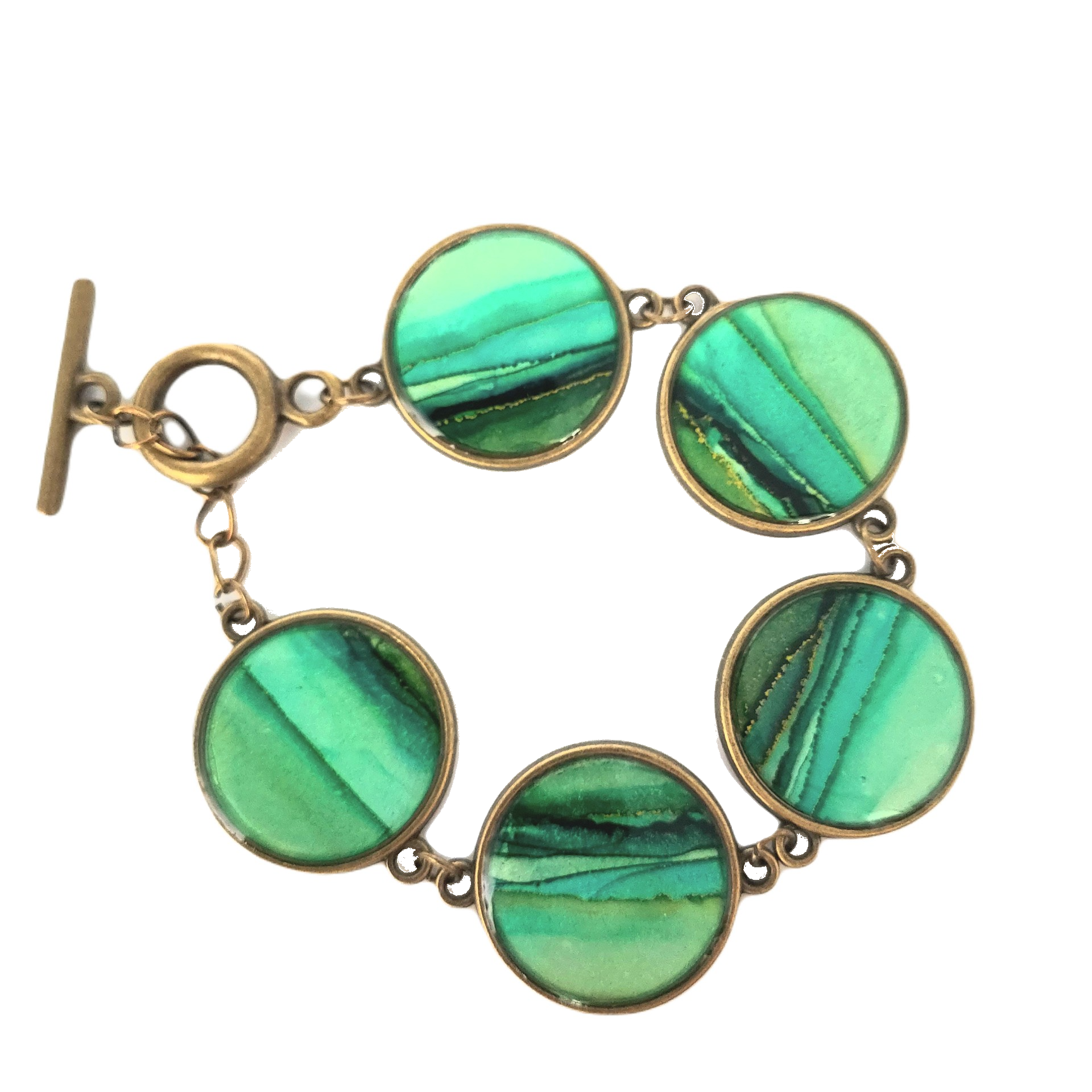 • One-of-a-kind hand-painted bracelet with "antique" bronze chain, toggle clasp, and five 20mm bezels